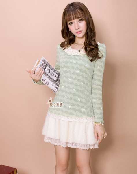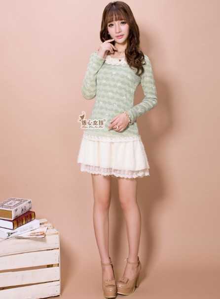 春季绿色连衣裙,百褶白色蕾丝裙摆,很飘逸好看。
