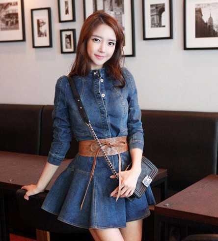 韩范十足的春季牛仔连衣裙,百褶的款式很显时尚感,搭配棕色腰带,凸显出纤细腰身曲线,搭配黑色小香风包包,尽展出优雅迷人气质。