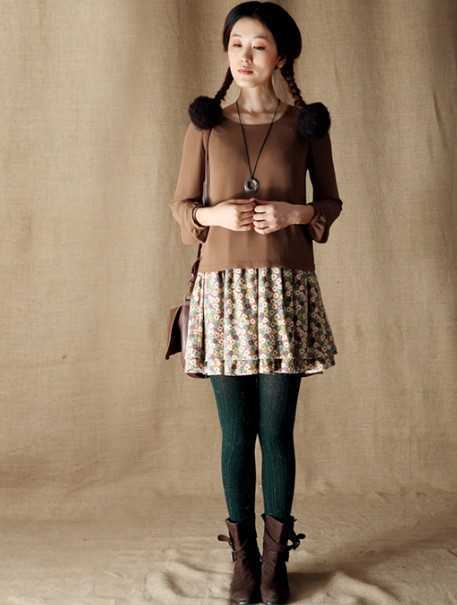 大气款春季咖啡色花朵连衣裙,拼色的款式更凸显时尚感,搭配青色打底裤和棕色短靴,散发出一股浓郁的文艺气息,加上棕色小包包,尽展文艺青年范儿。