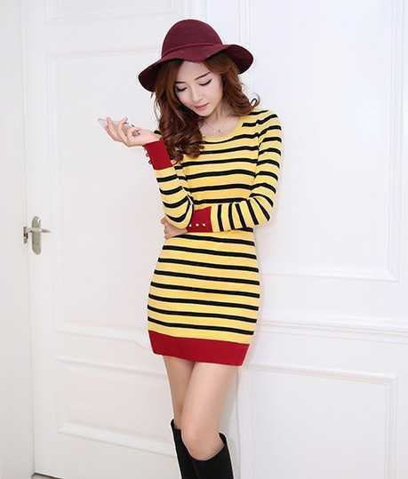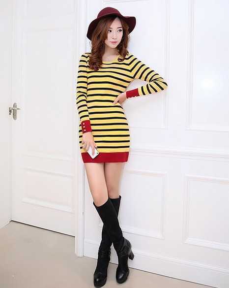 春季黄色条纹连衣裙,拼色的款式,随意穿出经典时尚装扮。