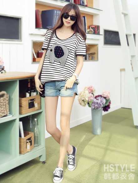 减龄必备春季条纹款卡通短T恤,搭配帅酷牛仔短裤,很清爽显时尚,搭配经典黑色帆布鞋,一身轻便时尚感装扮很适合春天穿着。