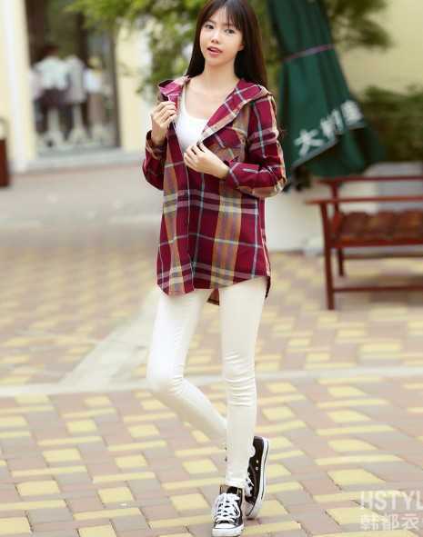鲜艳枣红色韩版格子衬衫,搭配性感白色背心,很清爽时尚,搭配净白小脚裤和帆布鞋,清新又显高挑,超好看的。
