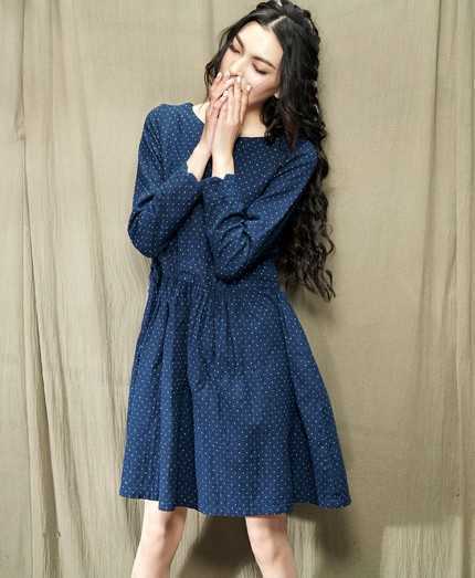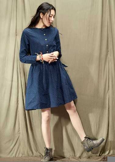 小波点春季蓝色连衣裙,增添几分甜美感,搭配复古风淡军色靴子,帅帅酷酷的,散发出一股文艺女青年范儿。