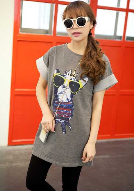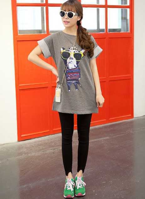 休闲宽松短T恤,戴眼镜的斗牛犬图案充满了可爱感,搭配黑色打底裤,完美拉长纤细腿部曲线,搭配抢眼绿色运动鞋,尽展随性慵懒style。