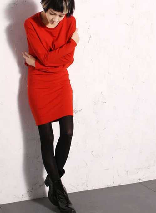 欧美范春季红色卫衣连衣裙,不规则的设计彰显时尚感,搭配性感黑丝袜,秀出纤细美腿,搭配帅酷黑色短靴,轻松穿出超有范装扮。