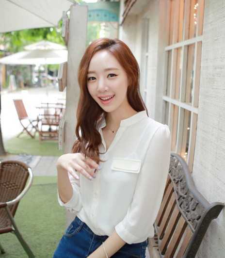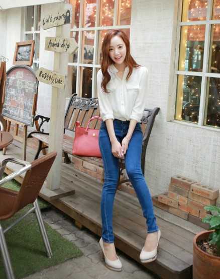 韩版米白色早春衬衫,休闲宽松的款式,让你穿着遮肉显时尚,搭配经典紧身牛仔裤,完美秀出纤细美腿,搭配白色高跟鞋,尽展出优雅迷人好气质。