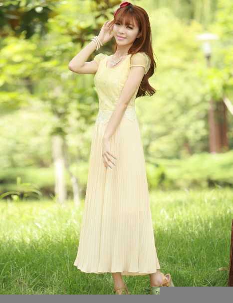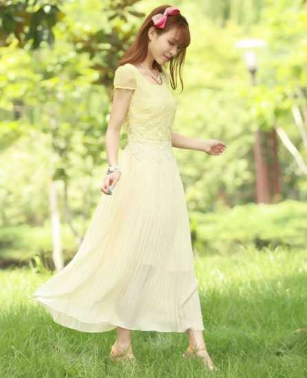 黄色超长裙摆连衣裙