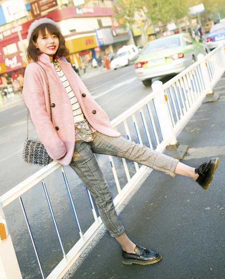 甜美的粉色薄款外套,很显青春活力感,搭配条纹衫,清爽时尚,搭配格子休闲裤,复古风十足,搭配学院风鞋子和小香风包包,很青春洋溢。