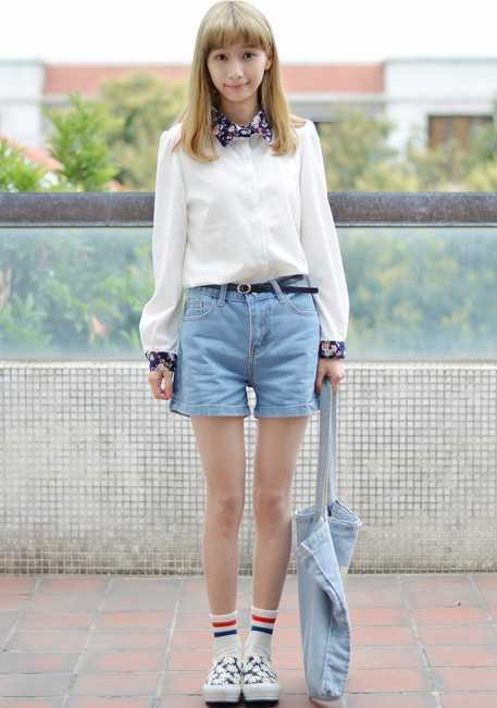 韩版春季碎花领衬衫,搭配基本款牛仔短裤,很简约时尚,搭配小清新碎花鞋子,穿出清新甜美感。