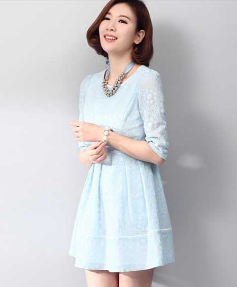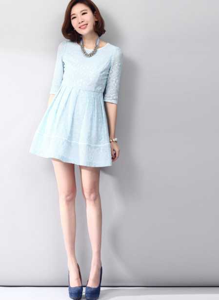 嫩蓝色春季连衣裙,增添几分清新气息,蕾丝设计很时尚性感,搭配蓝色高跟鞋,完美拉长纤细腿部曲线,搭配蓝色项链,与裙子很配很好看喔!