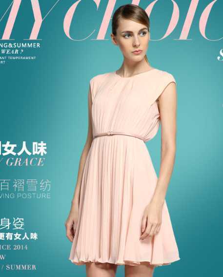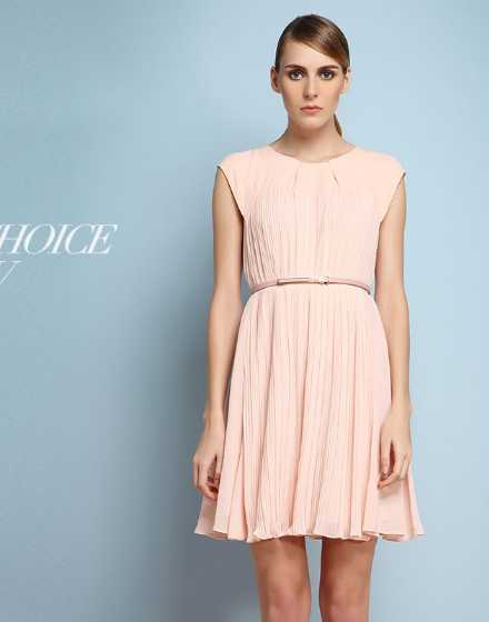 粉色百褶雪纺连衣裙,搭配粉色细腰带,完美拉长黄金身体比例 ,让你怎么穿都好看。