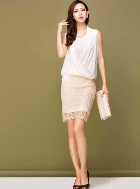通勤款蕾丝半身短裙,彰显女性迷人魅力,搭配白色不规则雪纺衫,优雅大气,黑色高跟鞋,高挑好身材尽展。