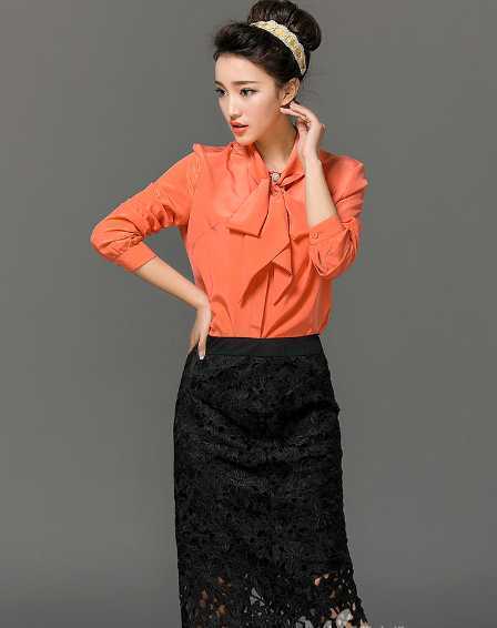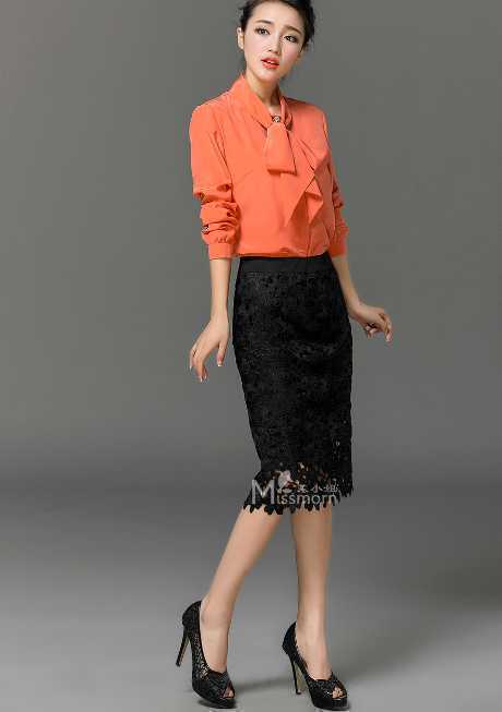 韩版修身蕾丝半身短裙,高腰设计,凸显完美高挑身材,搭配橙色雪纺蝴蝶结衫,衬出白皙好气色,搭配黑色蕾丝高跟鞋,性感妩媚感尽展。