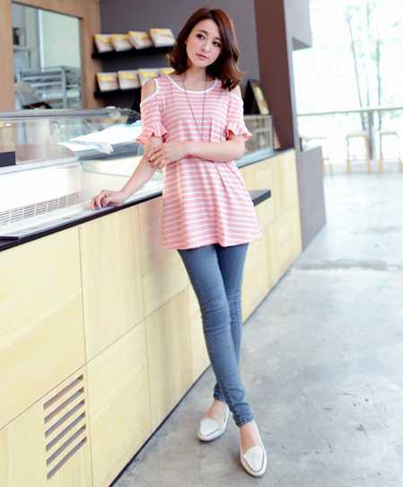 大码款条纹露肩衫,粉色颜色超减龄显嫩,搭配紧身牛仔长裤,修饰纤细腿部曲线美,搭配白色单鞋,休闲又舒适。