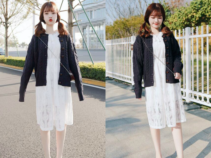 Look5:针织开衫+蕾丝连衣裙