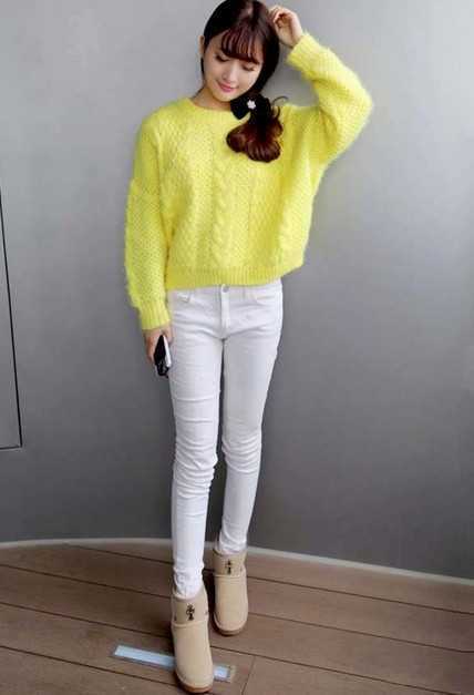 超显眼的荧光黄毛衣,优质的马海毛手感超好,穿起来很显白好看呢,巧搭纯白色紧身裤,清新又时尚,搭配温暖十足的雪地靴,完美演绎出清新时尚冬日穿搭。