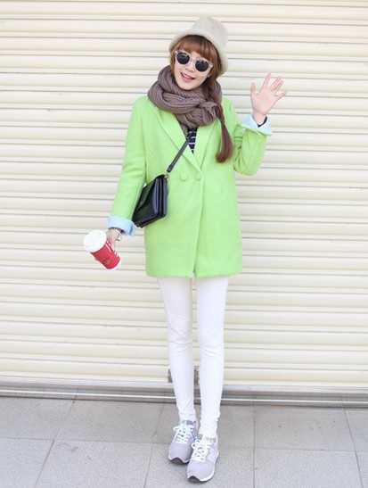 嫩嫩的冰淇淋绿色,时尚帅气的西装款,在冬日穿起来温暖又时髦,内搭百搭黑色横条,非常好看,下身巧搭纯白色裤子和运动鞋,洋溢出清纯靓丽冬日装扮。