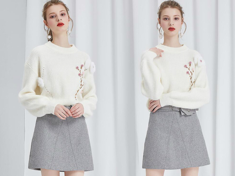 白加灰色的搭配简约大方,白色的毛衣版型略宽松,在洁白的毛衣上绣有一枝粉色梅花,看起来甜美不少,下身搭配的是一条呢子半身裙,呢子面料挺括立体,加上A字型的裙摆设计,恰好修饰腿型,对于大腿较粗的妹子来说不失为一个美好的选择。