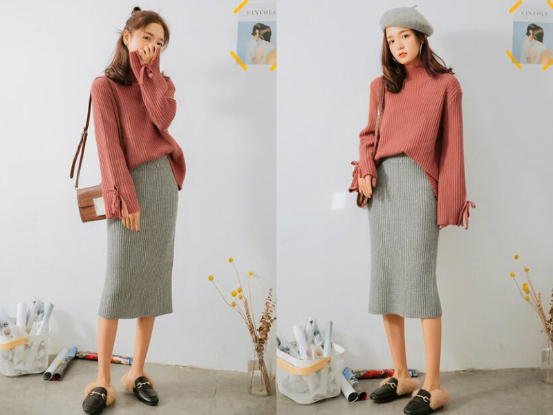 搭配2:毛衣+针织半身裙