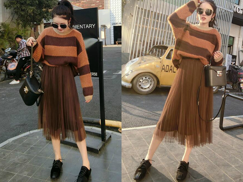 条纹拼接的毛衣近年来都比较流行,橙色与深棕色拼接暖暖的很是耐看,加上柔软的毛衣料子看起来更是保暖亲肤。下装选择的是一条巧克力色的网纱半身裙,与毛衣的颜色相近,使整套look的色泽和谐美观,飘逸的裙摆贴着小腿,从上往下看来显瘦又显高,戴上一副墨镜瞬间充满街拍范儿。