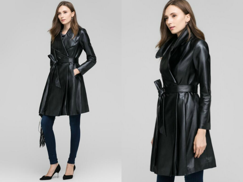 妹子穿着一件风衣型的皮衣,看起来本就很时尚拉风,在搭配一条紧身皮裤,整个人就更显酷气十足。皮衣下摆遮住大腿,中间腰带系上,瞬间拉长身形,气场无形中也变得强大了许多,脚上再搭配一双尖头高跟鞋,又增加一丝女人味,这样可柔可刚的搭配在妹子身上展现得很和谐!