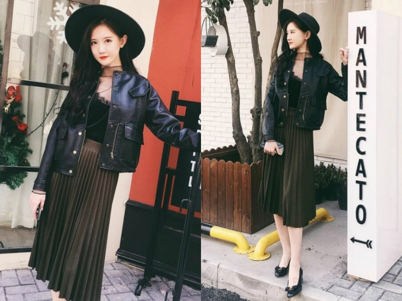 温柔中带着酷帅范的一款皮衣搭配,里面穿一件网纱型背心,看起来性感妩媚,下身配一条黑色百褶中长裙,增添柔美感,再穿上一件黑色短款皮衣,又流露出一些大方帅气感,头戴黑色大礼帽,更显大家风范。