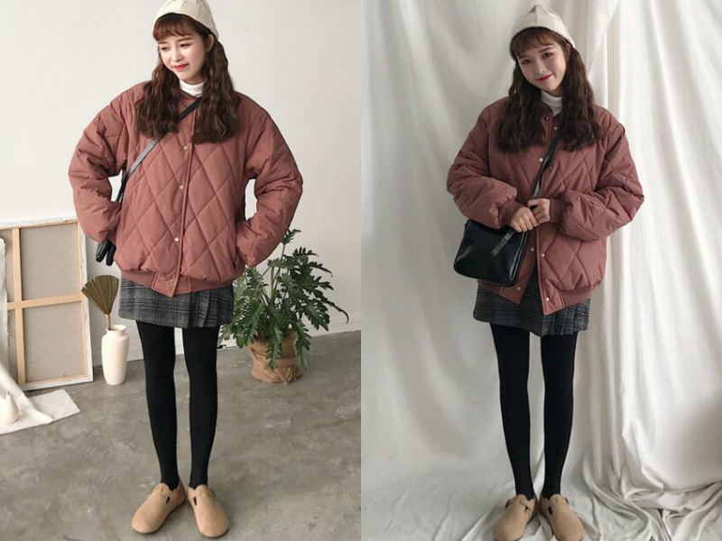 外穿一件暗枣红色的棉服外套,衬得妹子肌肤白皙,里面搭配一件白色半高领打底衫,露出一点领子别有一番特色,下身穿一条格纹半身A字裙,里面再穿一条黑色紧身裤,上身宽下身窄更突出妹子纤细的双腿。