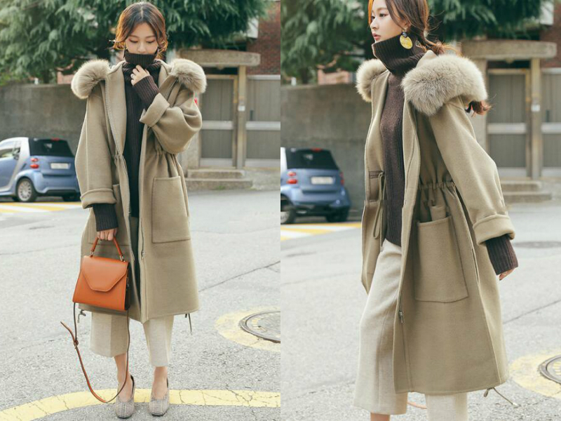 比较有韩范职场达人feel的一款服饰搭配,高领的巧克力色毛衣遮肉显瘦,高领的设计充当围脖给予脖子温暖,更衬托出妹子精致的脸蛋,加上外套一件收腰型毛衣外套,休闲又时髦。下面则搭配一条米色的阔腿裤,脚上穿一双同色系的细跟高跟鞋,显得休闲又有时尚气场,手提一个橙色包包,为整套装扮增添暖意与亮点。