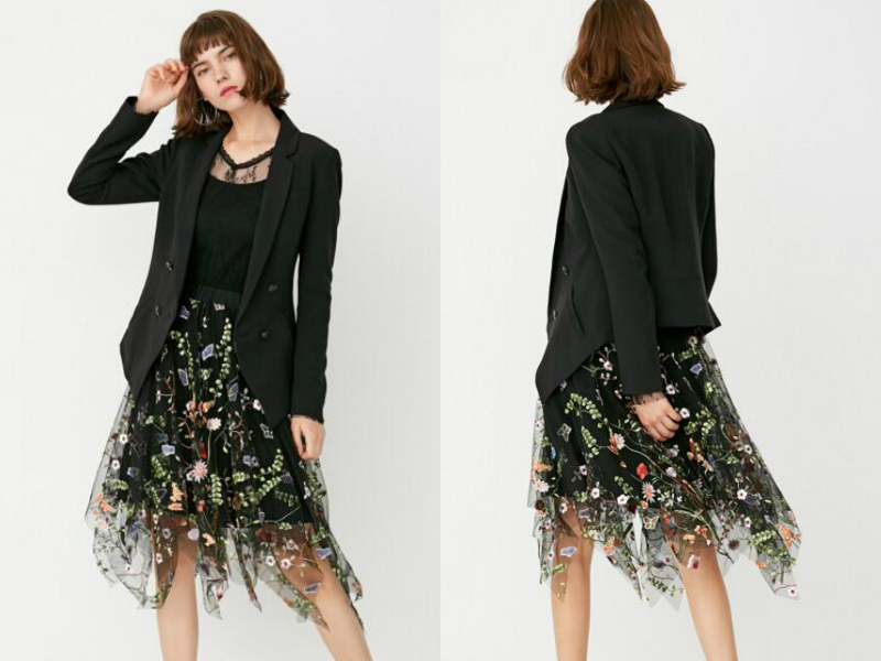 严谨中带着一丝淑女feel的一套服饰搭配,黑色的西装外套款式精致而简洁,版型合体修身,内搭一条碎花连衣裙,上部分是黑色刚好与外套相衬,下部分以黑色为底并布满碎花图案,显得清新别致,不规则的下摆更添新颖别致。