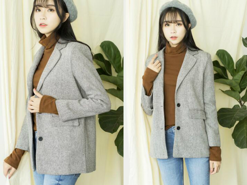 妹子以一件棕色的高领衫作为打底,外搭一件浅灰色的西服,看起来时尚而简约,下身则穿一条充满青春潮流气息的浅蓝色牛仔裤,整体颜色搭配跨度有点大,但并不会觉得不和谐,加上头戴一顶和西服同色系的贝雷帽,更添时髦感。