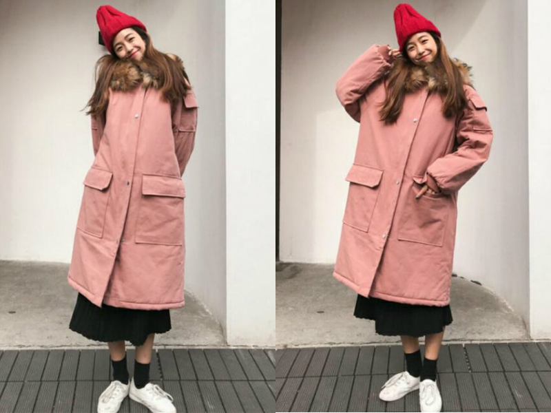 冬天必不可少的大衣,长款直筒版型,穿上很有显高的效果,简约大方的设计,粉色很有时尚感,毛绒绒的毛领厚实保暖又挡风,内搭毛衣加长款半身裙就很有层次感,头上再戴上一顶针织帽,女孩子冬天这样穿很显淑女范。