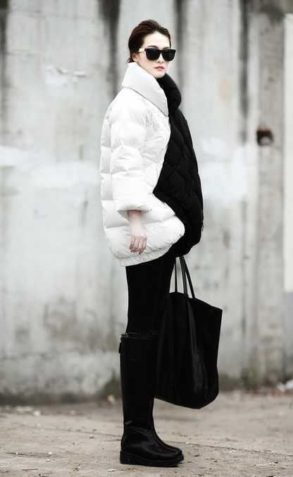 黑白色的拼接,完全颠覆了羽绒服臃肿的形象,有棱有角的拼接,使羽绒服显得更加的立体,而且轮廓线条强烈,搭配一条黑色的紧身裤和一双高筒靴,帅气十足,把欧美范的街头风展现得淋漓尽致。