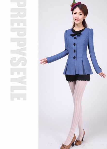 低调的沉蓝色外套,精致的裁剪,时尚修身的版型设计,完美勾勒出女性纤细的身材曲线,黑色的毛呢短款+竖条白色袜裤,甜美又显瘦,配上显高的淑女高跟鞋和贵妇般的小礼帽,整体装扮洋溢出贵妇般高贵气质,打造出小甜心又妩媚的女性魅力。