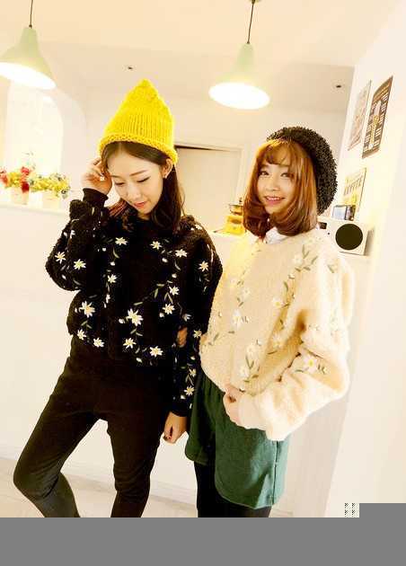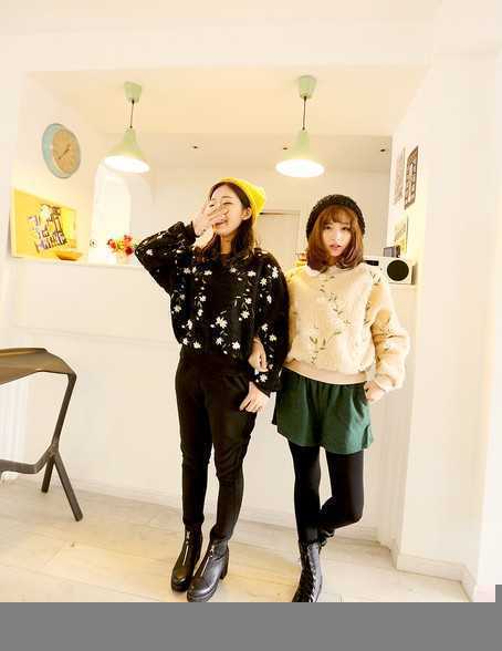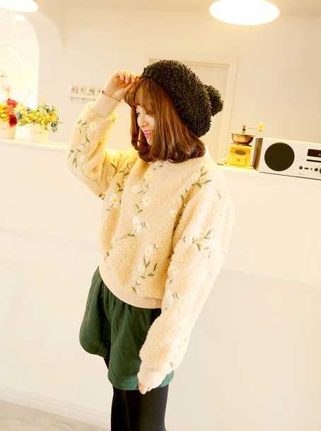 白色小雏菊刺绣精致甜美,搭配宽松绒料短裤,很青春洋溢呢,毛茸茸的毛线帽子,甜美时尚,让你温度加倍。