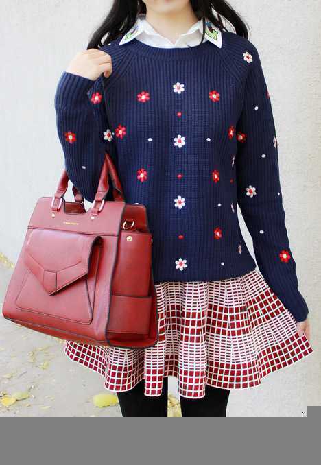 清新的小碎花刺绣设计毛衣,很舒适宽松,能很好收住腰间肉肉,内搭白色的衬衫,衬托出很时尚有范儿搭配,随意手拿着复古红包包,轻松装扮出游。