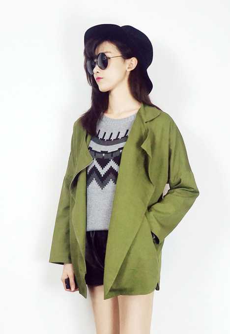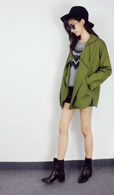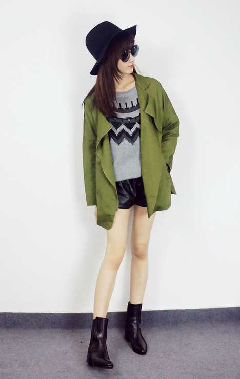 超帅气的大翻领,洋溢出随意慵懒格调,内搭灰色印花卫衣,下身搭配黑色性感小皮裤很好看,军绿色休闲风衣,低调的搭配穿衣也能很好打造出慵懒随意风。