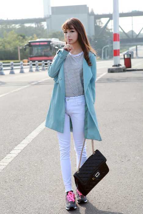 时尚的翻领设计,很好的显露出内搭条纹T衫,很时尚独特呢!下身搭配纯白色的裤子和醒目的玫红色运动鞋,很好看百搭,洋溢出萌范十足。