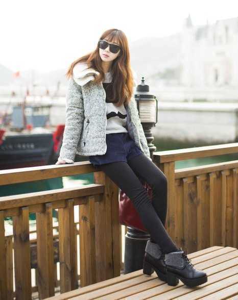 灰色系的翻领棉服是百搭款,内搭一件可爱的毛衣,下身穿上宝蓝色的短裤,再搭配上帅气的马丁靴。这种简约的搭配风格你喜欢吗?
