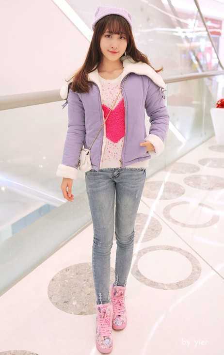 浅紫色的短款翻领棉服带来了温暖感。紫色是一种梦幻的颜色,适合甜美的小女生。内搭一件粉嫩的打底衫,再穿上浅色的牛仔裤,这样的搭配既简单,又不失时尚。