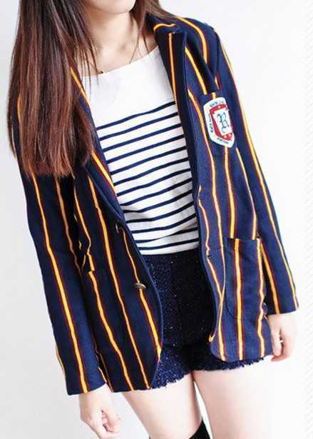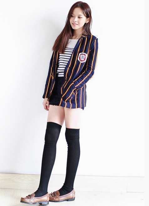 独特时尚的条纹撞色设计,精致的徽章装饰,穿出很有范的英伦学院风格,内搭简单的横条打底衫,洋溢出青春活动气息,下身混搭黑色过膝长袜和英伦风的棕色鞋子,一缕冬日时尚混搭风。