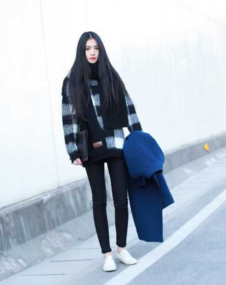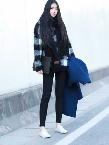 永不过时的格子毛呢,简洁清雅,穿出永不过时的冬日装扮,内搭简单的保暖打底衫,下身搭配百搭的黑色紧身裤和净白色鞋子,穿出学院风范儿,随意围上英伦风围巾,洋溢出时尚感十足。