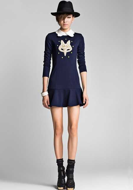 立体的狐狸图案,修身的藏蓝色连衣裙,凸显出婀娜多姿身形,随意搭配庞克风格的黑色高跟鞋和帅气的礼帽,高贵干练气质尽展,在寒冷的冬季搭配一件时尚大衣,轻松打造出轻熟女冬日style。
