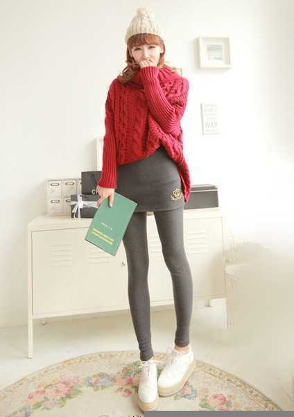 紧身款型加绒加厚打底裤,低调的灰色,低调又不失时尚,搭配复古红套头毛衣,是2014年最流行搭配穿衣法,搭配厚底 白色鞋子和保暖毛线帽,穿出甜美感十足冬装,轻易让你靓丽过冬。