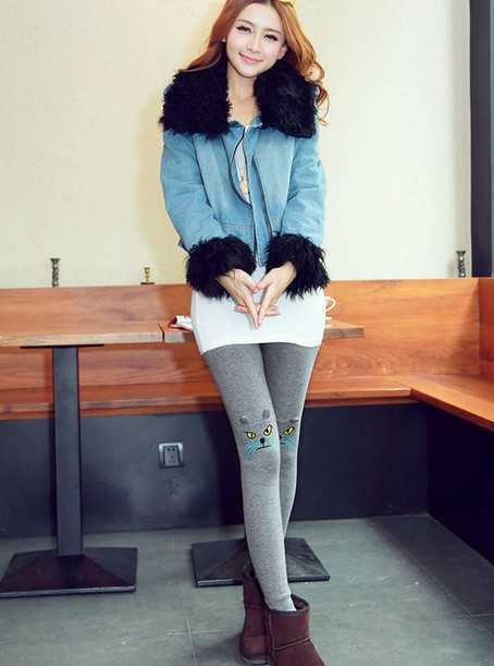 精致细腻的猫咪打底裤,搭配温暖十足的棉衣牛仔外套,显瘦又时尚,搭配咖啡色的雪地靴,一套时尚与温暖兼并的冬日装扮,让你冬季出街回头率百分百。