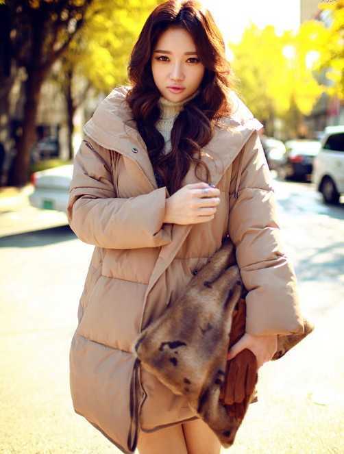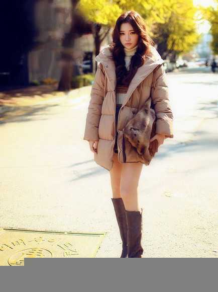 宽松版型米白色棉衣,内搭韩版的长款毛衣,散发出复古优雅气质,下身搭配棕色过膝长靴,帅气逼人,穿出复古百搭冬日装扮。