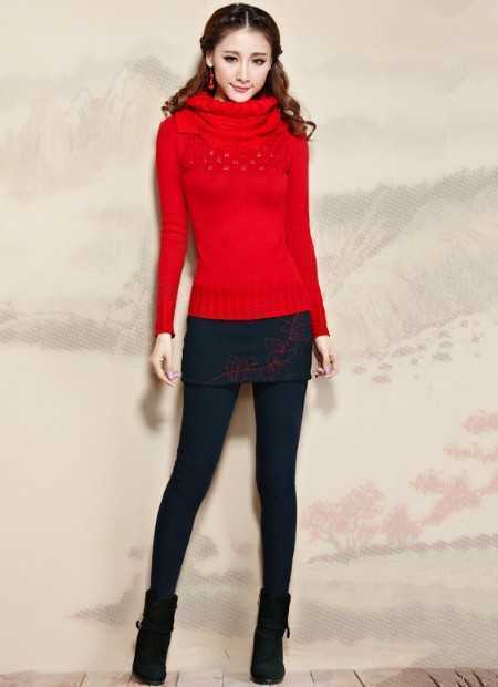 显高显瘦的藏蓝色打底裤裙,精美的印花,显得格外的时尚,搭配洋红色的高领针织衫,洋溢出新年喜气气氛,穿出非常抢眼靓丽,随意穿上黑色高跟鞋,百搭又显瘦,寒冷的时候再外搭一件黑色大衣,穿搭出优雅韩范气质。