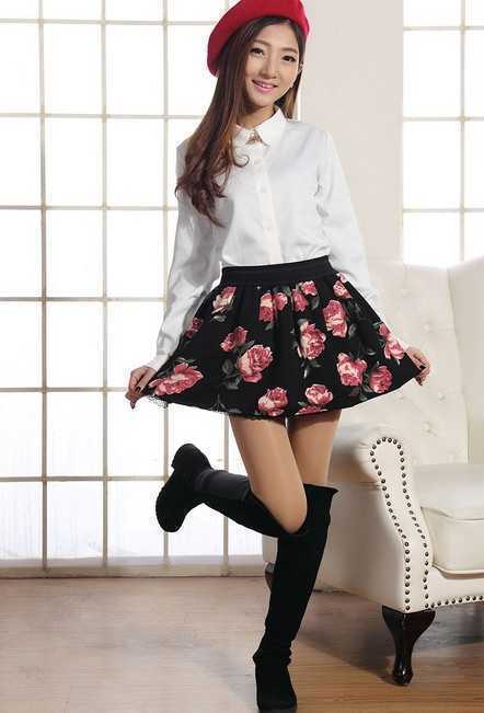浪漫的大红花印花,百褶的短裙,穿起来飘逸又性感,搭配净白色的衬衫,和过膝黑色长靴,穿出超显瘦时尚的冬日装扮。