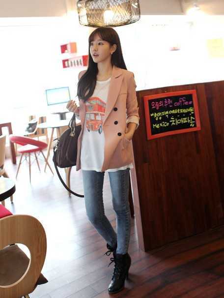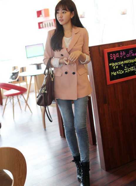 经典的双排扣设计,独特个性的剪裁,穿出时尚端庄感,搭配紧身牛仔裤,显瘦又百搭,搭配黑色马丁靴,轻松帅气穿出职场端庄感。