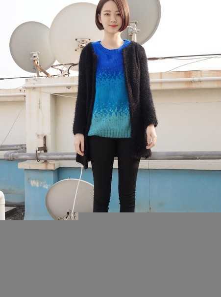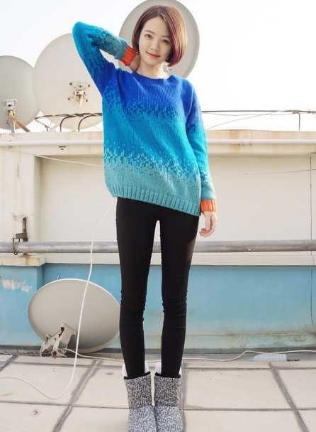 黑色百搭显瘦小脚裤,修身的款型,穿起来百搭又好看,内搭小清新的蓝色毛衣,让一身单调的黑色提亮了不少,外搭黑色毛衣外套,完美藏住肉肉,穿出时尚显瘦冬装搭配。
