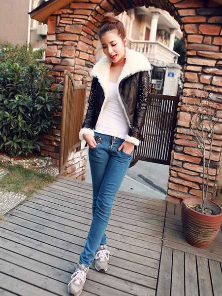 时尚的铆钉装饰,百搭时尚的款式,穿出优雅气质范,搭配紧身纯白色上衣,下身搭配经典蓝色牛仔裤,休闲舒适的冬装,随意穿搭时尚运动鞋,尽展时尚运动感。